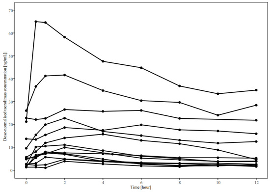 Dose-normalised concentration–time profiles of tacrolimus in 14 adult lung transplant patients.