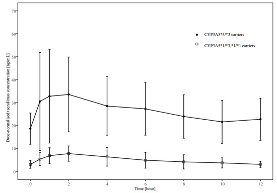 Dose-normalised concentration–time profiles of tacrolimus stratified by CYP3A5 genotype.