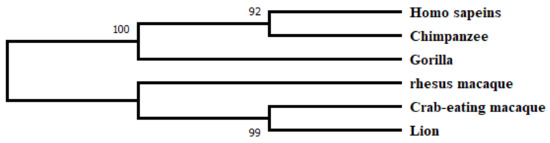 In addition, the BLAST tool was used to retrieve the same gene sequence from different organisms including chimpanzee, gorilla, rhesus macaque, crab-eating macaque, and lion as an out-group. All sequences were aligned globally to perform MSA using MEGA7. It is observed all sequences share a common domain (Figure 1), although the GLUT4 gene from the lion has a slightly different sequence.