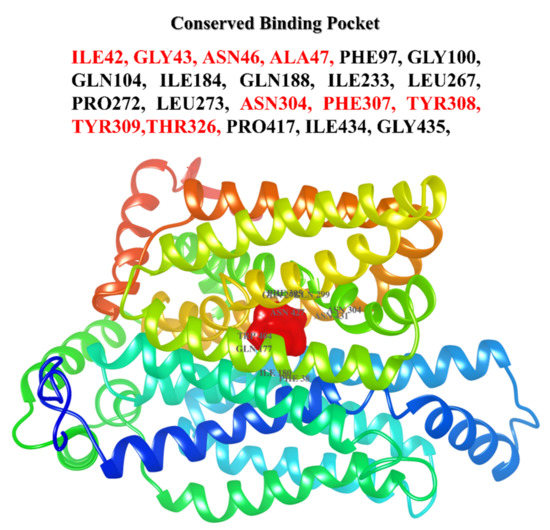 CoFACTOR server was used to predict minor and major binding sites of the putative ligand for the predicted protein. Specificity was provided from c-terminal residues for phytochemical binding containing conserved active site residues such as ILE42, GLY43, ASN46, ALA47, PHE97, GLY100, GLN104, ILE184, GLN188, ILE233, LEU267, PRO272, LEU273, ASN304, PHE307, TYR308, TYR309, THR326, PRO417, ILE434, and GLY435 compared to the residues of the active site for the template. In the predicted model GLUT4, the binding site of other substrates revealed the extensive conservation of tyrosine, serine, and isoleucine residues ILE184, GLN188, ILE233, LEU267, and PRO272. The residues of glycine were observed to be conserved at different positions in the GLUT4, which represent their vital role in phytochemical binding including GLY43, ILE184, ASN304, PHE307 represented by ILE42, ASN46, ILE184, ASN304, PHE307, and TYR308 which may play a crucial role in the specificity of GLUT4 (Figure 4).