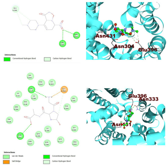 In molecular docking studies, two compounds show the hydrogen bond interaction with the protein target, which indicates that both molecules are highly selective, and the salt bridge interaction depicts a stronger interaction with the target as shown in Table 3. The residues ASN304 and ASN431, ASN 333 form the conventional hydrogen bonds, and GLU396 form the carbon-hydrogen bonds, and the salt bridge with the target, and these two compounds could be a good inhibitor against the selected protein targets (Table 2).