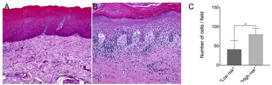 Representative image of hematoxylin–eosin (HE) staining from a (A) “low-risk” lesion biopsy and a (B) “high-risk” lesion biopsy; (C) Number of inflammatory cells per field in samples from “low-risk” and “high-risk” lesions. The mean number of immune cells counted per field in paraffin-embedded tissue samples of “low risk” and “high risk” lesions. * p < 0.05.