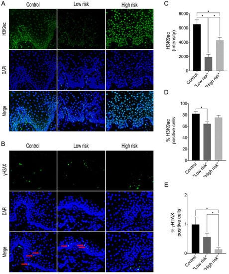 Representative images of immunofluorescence analysis for (A) H3K9ac and (B) γH2AX in control, “low-risk” and “high-risk” groups (Alexa Fluor 488, 40×) The red arrows indicate positive staining in the intraepithelial region. (C) Graphics of quantitative analysis of H3K9ac immunofluorescence intensity, (D) Percentage of the total number of H3K9ac positive cells (E) Percentage of the total number of γH2AX positive cells. * p < 0.05.