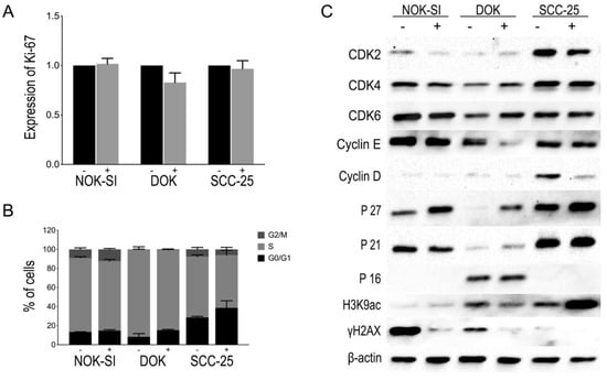 The exposure of oral keratinocyte lineages (NOK-SI, DOK, or SCC-25) to PBMCs for 48 h could not significantly influence the proliferation potential of these cells as observed in the relative MIF of Ki-67 expression (Figure 3A). Likewise, there were no statistically significant differences in the distribution of the cells in the different phases of the cell cycle (Figure 3B). However, the accumulation of cells in phases G0/G1 showed an upward trend. Therefore, the production of several proteins involved in the G1 phase of the cell cycle was evaluated through Western blot. An expressive increase in p27Kip1 levels was observed in the cell lineages NOK-SI, DOK, and SCC-25 after co-culture with the PBMCs, with this increased expression being more evident in the DOK cell line. In addition, there were no significant changes in p16INK4 and p21WAF1/Cip1 levels in the NOK-SI, DOK, or SCC-25 lineages. The levels of cyclin-dependent kinases (Cdks) and cyclins were also evaluated to verify the proteins and enzymes involved in cell cycle progression. The synthesis of cyclin E and cyclin D decreased in the co-culture of PBMCs with DOK and SCC-25, respectively. Simultaneously to protein levels analysis involved in the cell cycle, the levels of H3K9 acetylation (H3K9ac) and H2AX phosphorylation were also evaluated utilizing Western blot. The results showed an increase in H3K9ac levels in the SCC-25 lineage in co-culture with PBMCs and a slight reduction in the DOK group in co-culture with PBMCs. In addition, a reduction in H2AX phosphorylation levels in all keratinocyte lineages cultivated with PBMCs was observed. These results indicate a reduction in the levels of DNA damage in all the oral keratinocyte lineages studied in the presence of PBMCs. Figure 3C shows representative images of a Western blot assay to check the protein content of proteins involved in cell cycle control, H3K9ac, and H2AX phosphorylation, using total protein extract from keratinocyte lineages with and without contact with PBMCs.