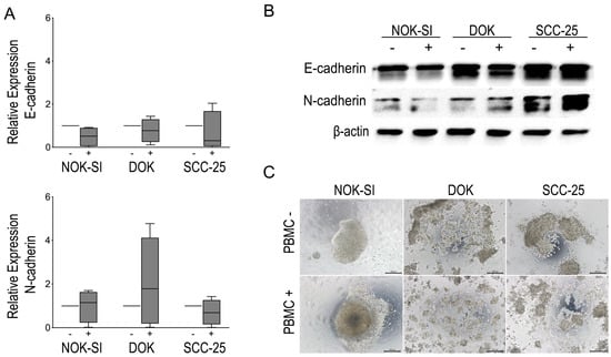 To evaluate whether PBMCs influence differently the EMT of the dysplastic keratinocyte lineages compared to the tumor and control group, the cadherin switching was examined by RT-qPCR and Western blot. Although no statistically significant difference in the levels of cadherins mRNA was identified, it was possible to observe a tendency in the suppression of E-cadherin and an increase in the expression of N-cadherin in the co-culture of DOK with PBMCs. In addition, the cadherin switch was observed by Western blot analysis in the same group after 48 h of contact with PBMCs. The SCC-25 lineage presented high levels of the two markers in both experimental conditions, whereas N-cadherin levels increased slightly after co-culture with the PBMCs. Furthermore, the SCC-25 lineage revealed high levels of N-cadherin expression compared to NOK-SI and DOK cells irrespective of contact with PBMCs.