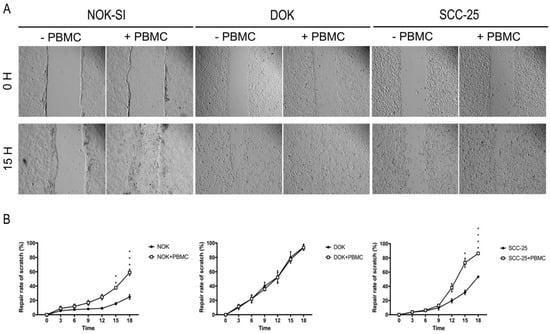 Influence of PBMCs on cell migration of NOK-SI, DOK, and SCC-25 cell lines. (A) Representative images of each condition at 0 and 15 h. (B) The presence of PBMCs was able to reduce the wound size in NOK and SCC-25 cell lines. * p < 0.05.