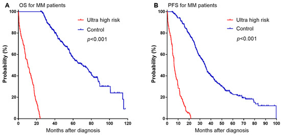 With the use of new drugs, the survival of multiple myeloma patients has greatly improved, with some young patients surviving approximately 10 years [2]. However, MM is still an incurable disease, and for some UHR patients, remission is difficult to achieve through induction therapy, or they have early recurrence after remission, resulting in significantly shorter survival. Currently, there is no uniform definition of UHR patients’ survival [9,10,11]. In this study, UHR MM patients with a survival of less than 24 months were screened to investigate their clinical features and risk factors.