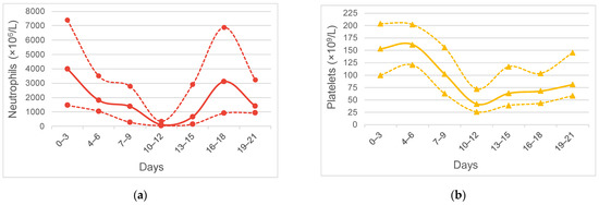 Patients had their neutrophil count decreased to a median nadir (IQR) of 134 (30–396) × 106/L at median (IQR) day 11 (10–12) that had recovered by day 15 (14–17) with the use of G-CSF (Figure 1a). After the cessation of G-CSF use, the neutrophil count dropped back to the near-normal range. Patients had their platelet count decreased to a median nadir (IQR) of 35 (23–83) × 109/L at median (IQR) day 11 (10–13) that recovered by day 17 (14–21) (Figure 1b). The recovery of the platelet count was slower than the neutrophil count; no patients in this cohort used thrombopoietin.