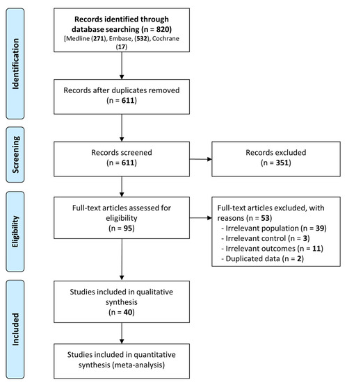 In total, we identified 820 studies, with 611 studies remaining after we removed duplicates. We excluded 40 studies for irrelevance after assessing their titles and abstracts and retrieved the full texts of the 95 remaining relevant studies. We then excluded studies that had an irrelevant population (n = 39), irrelevant control (n = 3), irrelevant outcome (n = 11), or duplicated data (n = 2). Finally, we conducted a meta-analysis and systematic review, including 40 eligible studies with 17,753 patients with hip fractures, among which were 2280 patients with COVID-19 (12.8%) [11,20,21,22,23,24,25,26,27,28,29,30,31,32,33,34,35,36,37,38,39,40,41,42,43,44,45,46,47,48,49,50,51,52,53,54,55,56,57,58]. Except for Vialonga et al. (2020), all studies had a research period in 2020 [54]. Hall et al. (2022) reported the highest number of COVID-19 infections with 651 [36], followed by Rashid et al. (2022) with 517 infections [50]. Among the studies that reported the frequency of surgery, Barker et al. (2021) had the lowest rate of surgical treatment, with only 60% performed [21]. In all reported studies, the frequency of female patients was higher than that of male patients. Notably, in Jiménez-Telleria et al. (2020), the frequency of male patients was as low as 21% [37]. Table 1 shows the baseline characteristics of included studies, and Figure 1 presents the study selection flowchart.