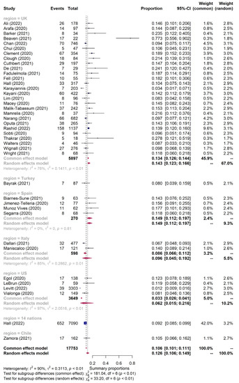 The pooled 30-day mortality was 12.6% (95% CI 10.6–14.9%, I2 = 90%) during the COVID-19 pandemic for the 40 included studies involving 17,753 hip fractures (Figure 2). In the United Kingdom, the 30-day mortality of hip fractures during the pandemic was 14.3%; in Spain, it was 14.9%; in Italy, it was 9.6%; and in the United States (US), it was 6.2%.