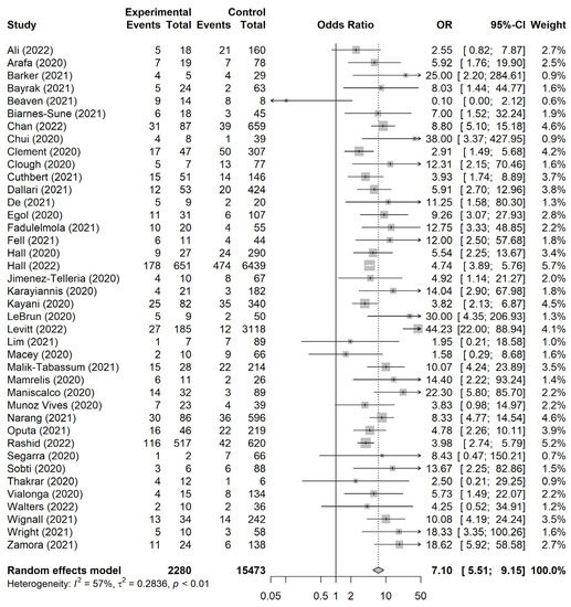 We conducted a meta-analysis of patients with hip fractures between those with and without COVID-19 from the 40 included studies. Those with COVID-19 had significantly increased mortality compared to patients who did not have COVID-19 (OR, 7.10; 95% CI, 5.51–9.15; I2 = 57%; Figure 3)