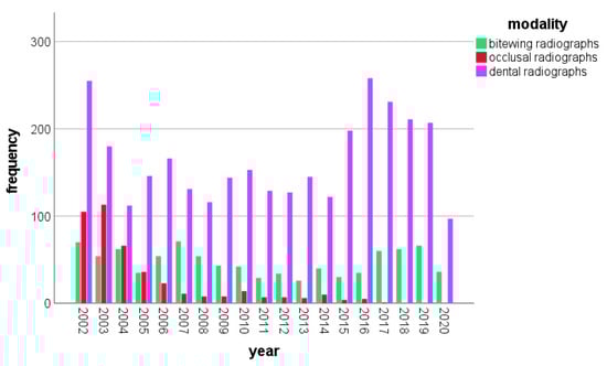 Dental radiographs were the most frequently executed modality in all years. In particular, 70.2% (n = 3.128) of all intraoral radiographs were dental radiographs, followed by 20.3% (n = 903) bitewing radiographs. The least frequent modality was occlusal radiographs, amounting to 9.5% (n = 424). The number of occlusal radiographs decreased over the years, from n = 105 in 2002 and n = 113 in 2003 to zero in the years 2018, 2019 and 2020 (Figure 2). There was a change in the use of bitewing radiographs. Whereas, in 2002, bitewings accounted for 16.3% (n = 70) of all annual intraoral radiographs (n = 430), in 2019, the percentage was 24.2% (n = 66) of all 273 intraoral exposures.