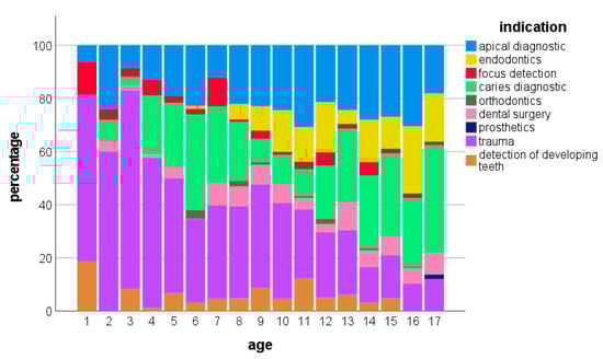 Further variations in indications for intraoral radiographs were observed in relation to the age of the patients. Children aged under four years underwent radiographs predominantly for trauma, followed by apical diagnostics and the detection of foci (Figure 3). Between the ages of four and eight years, besides trauma diagnostics, a remarkable share of radiographs for caries diagnostics occurred. A second increase in radiographs for caries diagnostics appeared from the age of twelve years, parallel with a decrease in trauma indications. Starting at eight years of age, an increasing number of radiographs accompanying endodontic treatments could be observed (Figure 3).