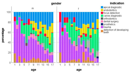 Comparing the patients by gender, boys were X-rayed more frequently than girls, and 59.7% of all intraoral radiographs were taken in boys. Especially for trauma (66.5%) and endodontics (67.2%), boys received significantly more radiographs than girls (33.5% for trauma and 32.8% for endodontics) (p ≤ 0.00). Girls were significantly more frequently X-rayed for caries diagnostics than boys (28.1% vs. 19.1%, p ≤ 0.00).