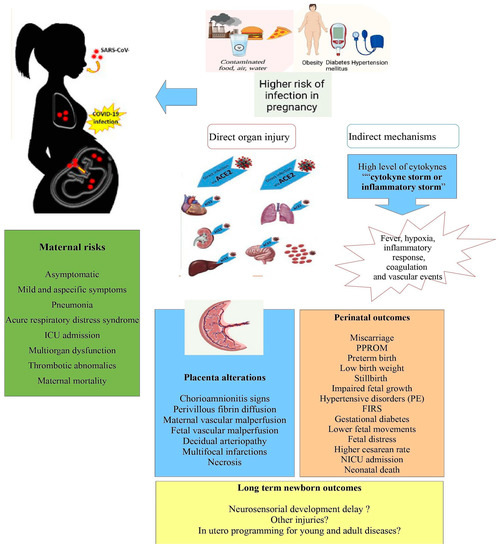 Several unfavorable perinatal outcomes were reported in cases of elevated SARS-CoV-2 infections during gestation such as miscarriage, preterm premature rupture of the membranes (PPROM), low birth weight, impaired fetal growth (small for gestational age and intrauterine growth restriction), hypertensive disorders, gestational diabetes mellitus (GDM), lower fetal movements, fetal distress, higher cesarean rate, neonatal intensive care (NICU) admission, and neonatal death as the renin–angiotensin system (RAS) is downregulated, causing increased blood pressure and placental vascularization dysfunction [18]. The maternal and perinatal consequences of SARS-CoV-2 infections are gaining interest to determine the possible effects among youth and adults as “in utero” programming. Future investigations may provide answers to these questions through long-term follow-ups.