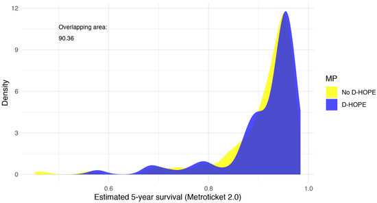 Kernel density plot showing comparable 5-year survival probability by preservation modality, as estimated using Metroticket 2.0 model.