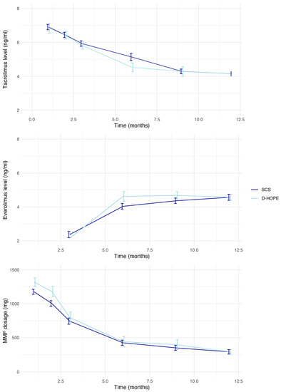 Immunosuppression levels and dosage according to preservation modality in the 12 months after transplant. Lines represent mean values, whereas vertical error bars represent standard error.