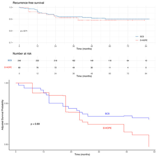 Median follow-up was 59 (36–72) and 40 (32–52) months in SCS and D-HOPE groups, respectively. Survival analysis showed comparable RFS rates between study groups (log-rank p = 0.71). Median (95% confidence interval) 1-year RFS was 96% (94–99%) and 95% (90–100%) in the SCS and D-HOPE groups, respectively (Figure 3). To account for potential confounders, IPTW-adjusted RFS analysis was performed, including donor age, donor BMI, macrovesicular steatosis, cold ischemia time, recipient age, HCC grading, and microvascular invasion as covariates. These variables were selected due to their association with HCC recurrence or unbalance between study groups. Even after adjustment, RFS did not significantly differ between study groups (p = 0.89) (Figure 3, second panel).