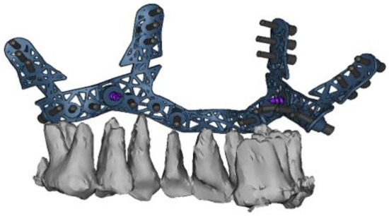 The drilling/osteotomy template and the PSI was designed and manufactured by Materialise© (Leuven, Belgium) after an online planning session with the responsible surgeon team. In the planning, the pre-drilled holes and the osteosynthesis screws were positioned in such a way that the tooth roots were spared (