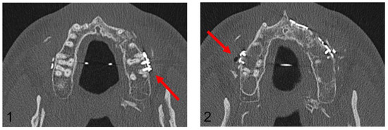 30]. This correlates with the data of the present work. In both the maxilla and mandible, the OPG evaluation showed significantly more root lesions than were verified via CT. No additional injuries were detected with CT scans compared to OPGs. This was to be expected, as the evaluation of OPGs as an examination tool for the detection of dental injuries is rather limited due to the extremely high number of false positive indications of dental damage and the correspondingly low specificity. We suggest that orthopantomograms alone are not suitable for detecting dental injuries caused by inserted osteosynthesis screws, and 3D imaging can proof diagnosis in necessary cases. However, its indication to assess the position of the osteosynthesis material, the osteotomy course, and the condylar position post-operatively remains valid.