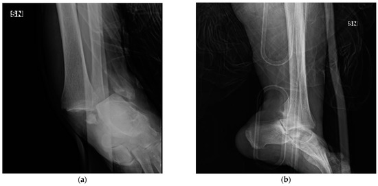 - Fahey, J.J.; Schlenker, L.T.; Stauffer, R.C. Fracture Dislocation of the Ankle with Fixed Displacement of the Fibula behind the Tibia. Am. J. Roentgenol. Radium Ther. Nucl. Med. 1956, 76, 1102–1113. [Google Scholar] [PubMed]