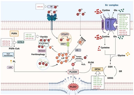 PUFAs can be synthesized starting from the acyl-CoA synthetase long-chain family member 4 (ACSL4) that binds PUFA to coenzyme A (CoA) to produce acyl-CoA. Afterward, thanks to the action of several acyltransferases, acyl-CoA can be re-esterified in phospholipids [41,42]. Linoleic acid and arachidonic acid are the most abundant PUFAs in the cell that can be oxidized into hydroperoxides by lipoxygenase (LOX) action. Indeed, LOXs are enzymes that contain the iron element and use it as a cofactor for catalyzing the deoxygenation of both esterified and not esterified PUFAs to produce lipid hydroperoxide in a pro-ferroptosis full picture [11,35,43]. Thus, iron metabolism (i.e., iron levels), antioxidant actions, and lipid metabolism (i.e., phospholipid peroxidation) each have an essential role in triggering critical changes in the cell, leading to cell death through ferroptosis. Regarding the many levels in which ferroptosis can be regulated, the role of non-coding RNAs and especially microRNAs may represent a crucial determinant to finely tune this cell death pathway.
