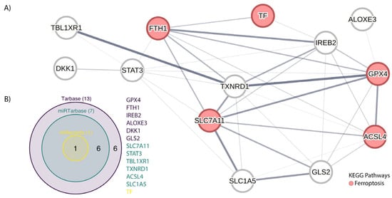 (A) Protein–protein interaction network for the main genes participating in the ferroptosis pathways, which represent the targets of the miRNAs reported in Table 1. The interactions show both functional and physical associations, so that one edge may represent the physical complex or another soft association. The analysis was conducted using STRING v11.5 software, setting the confidence parameter to 0.15 (edge thickness indicates the strength of data support: 0.15 thin and 0.9 thick). (B) Venn diagram for the validated targets in the Tarbased, miRTarbase, and miRecords database; the colors of the genes specify the database in which they are located. As shown, Tarbase collects all genes under study.
