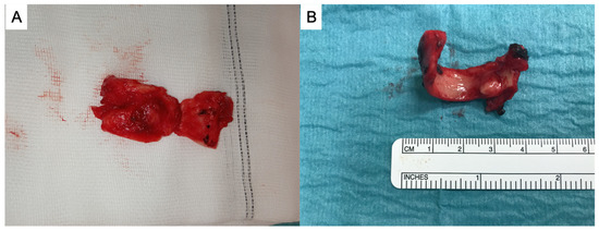 Definitive surgical treatment consisted of resection of the stenotic segment of airway with primary end-to-end anastomosis for reconstruction through cervicotomy. During surgery ventilation was assured through cross-field ventilation or by the placement of a laryngeal mask according to the patient. The end-to-end anastomosis was performed with interrupted, lubricated, 4–0 polyglactin 910 (Vicryl; Ethicon, Sommerville, NJ, USA). No muscle flap was used to cover tracheal anastomosis. The number of tracheal rings involved was systematically recorded. All procedures were performed by an expert thoracic surgeon (U.C and E.M). In Figure 1 are shown two tracheal resections, respectively, performed for non-COVID (A) and COVID stenosis (B).