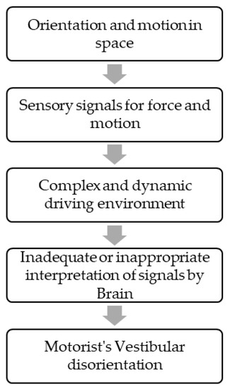 Vestibular symptoms as a passenger, i.e., motion sickness, are a well-known entity. Vestibular symptoms can also happen while driving in some vestibular disorders such as vestibular migraines, Meniere’s disease, etc. [5]. In 1985, Page et al. described patients who had episodes of disorientation exclusively while driving a car. This state of spatial disorientation was attributed to inadequate or misinterpreted sensory signals by central brain areas responsible for orientation and motion in space (Figure 1).