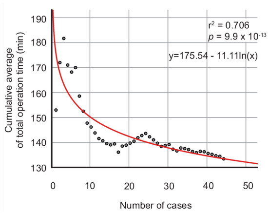 Cumulative average of total operation time of robotic single-site radical hysterectomy. Red line indicates optimized fit model of the cumulative average of the total operation time: y = 175.54 − 11.11ln(x) with optimized level r2 = 0.706 (p = 9.9 × 10−13).