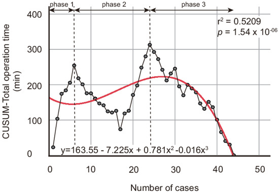 Cumulative sum (CUSUM) analysis for total operation time of robotic single-site radical hysterectomy. Red line indicates optimized fit model CUSUM-T where y = 163.55 − 7.225x + 0.781x2 − 0.016x3 with optimized level r2 = 0.5209 (p = 1.54 × 10−6). Two dashed lines represent breakthrough points (6th case and 24th case) and changes in phases of learning curve. Mean total operation times in phase 1, phase 2, and phase 3 were 197.7 ± 29.0, 158.5 ± 29.7, and 139.6 ± 21.25 min, respectively.