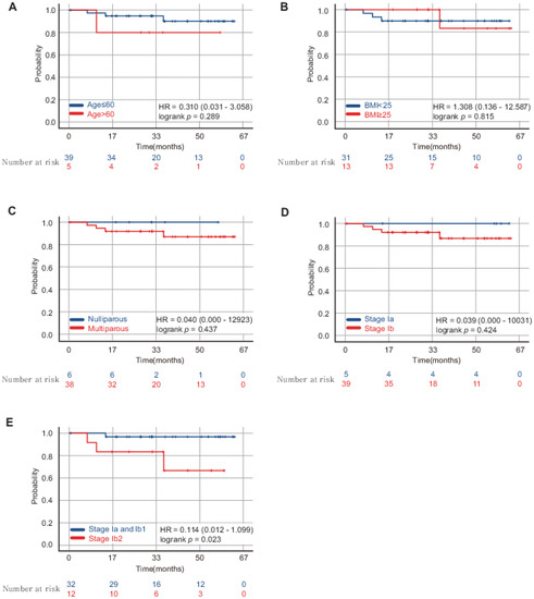 Patients with stages Ia2 and Ib1 cervical cancer showed better disease-free survival (DFS) than those with stage Ib2 cervical cancer following robotic single-site radical hysterectomy. Survival analyses were conducted through sub-dividing patients’ characteristics into age, BMI, parity, and stage. (A–C) Sub-group of patients according to the patient characteristics did not affect the DFS. (D) DFS was not significantly different between sub-group of five patients in stage Ia and 39 patients in stage Ib. (E) Stage Ia2 and Ib1 sub-group showed better DFS than stage Ib2 sub-group. HR: Hazard ratio with 95% confidence interval in brackets.