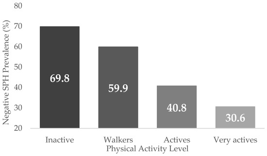A dependency association was found between the PAL and SPH. Thus, Table 2 shows the negative and positive SPH prevalence according to the PAL, displaying differences in the proportions of negative and positive SPH between the Inactives/Walkers and the Active/Very active PAL groups.