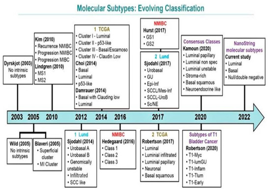 Over the past decade, there have been several molecular classification systems independently identified by various groups (Figure 3). These classifications are based on RNA and/or immunohistochemistry (IHC) expression characteristics [40,41,56,57,58,63,64,65,66,67]. There exists a significant overlap among all efforts to amalgamate the terminology and systems [64]. The most comprehensive working classifications include those proposed by the Lund University group, TCGA group, MD Anderson Cancer Center Group, and a simplified four-gene signature-based molecular classification with Nano Stringn Counter assay proposed by Lopez-Beltran and colleagues [39,40,52,55,56,63,65,66,67].