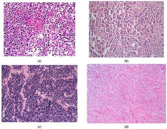 Sarcomatoid carcinoma is another extremely rare aggressive tumor subtype comprising about 0.3% of all primary urinary bladder tumors; it carries an overall dismal prognosis [10,41,93,94]. The presence of a mesenchymal component in UC is designated as sarcomatoid UC. This subtype can also exist with other subtype histologies such as glandular, squamous and/or small-cell, or NE differentiation [10,41]. The most common morphology is that of a spindle-cell proliferation; others include myxoid, pseudo-angiosarcomatous, and undifferentiated pleomorphic sarcoma-like morphology, as well as true heterologous elements such as chondrosarcoma, osteosarcoma, fibrosarcoma, leiomyosarcoma, and rhabdomyosarcoma [41,94,95]. A monoclonal cell origin has been suggested for both sarcomatous and urothelial components within the same tumor due to significant overlap in the molecular events, such as loss of heterozygosity. The clonal divergence might occur during tumor progression and differentiation [41,96]. At a molecular level, this tumor type is enriched with mutations in TP53, RB1, and PIK3CA, and is associated with the dysregulation of the epithelial–mesenchymal transition pathway [41,96,97] (Figure 4d).