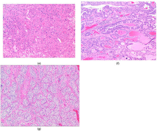 Nested UC represents a rare, morphologically deceptively bland tumor, associated with an aggressive clinical course [41,102]. These tumors exhibit small, closely packed, poorly defined, and haphazardly arranged, confluent irregular nests of bland-appearing tumor cells without cytologic atypia, infiltrating the lamina propria and the muscularis propria with an associated stromal reaction [41,102]. A high rate of TERT promoter mutation is the only molecular finding detected in this subtype of UC to date [41,103] (Figure 4g).