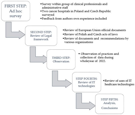 The study methodology involved a five-step process (Figure 1). First, we conducted an ad hoc survey within a group of clinical professionals (nurses and physicians) and administrative staff (registration desks) at the two participating hospitals to identify the key data protection issues and challenges. In addition, the study investigators provided feedback based on their own professional experience. All of the authors of this study work in the health care field—more specifically, at cancer care hospitals—and thus have practical experience in implementing data protection in the context of clinical practice in oncology. Second, we reviewed the legal framework surrounding data protection. In this review, we considered official documents issued by the European Union (EU) and the relevant laws in Poland and the Czech Republic. We also reviewed recommendations made by professional health care organisations (e.g., medical associations, etc.) and compared the laws and binding provisions issued by the relevant regulatory bodies in Poland and the Czech Republic. The third step was an observational phase carried out during the year 2022, during which we carefully observed all practices related to the previously identified data protection issues. Fourth, we reviewed the information technologies used to facilitate healthcare delivery at the two participating hospitals in compliance with data protection regulations. Fifth, we analysed the data collected during steps 1–4, and synthesised these findings with a review and discussion of the current rules and regulations.