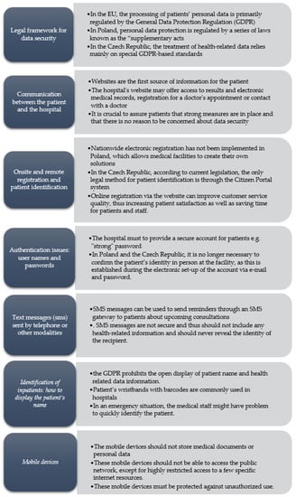 The website, apart from presenting general information about the hospital [22,23] should also provide a mechanism to allow patients to contact hospital staff. Alternatively, communication can also be carried out through a dedicated, secure portal (with robust patient identification), created specifically for this purpose. The website should offer a range of services for patients, such as online registration, access to test results and/or electronic medical records, information on the current number of patients waiting for an appointment, and the possibility to schedule an online consultation (videoconference or chat) with a physician or nurse. Adding these functions to the website, even if carried out gradually, would modernise the website to better meet patient needs over time, with the attendant social and economic benefits. However, implementing these services requires close cooperation between the hospital management team, the IT department, and specialised external providers with the knowledge and skills to create new solutions, including data protection. Nowadays, patients expect to obtain more than general information from the website, but they also expect to have access to their medical records. They also want to know how their data are processed and what security measures are in place.