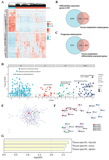 Identification of dysregulated PRGs. (A) Heatmap of DEGs in OC and normal ovarian tissue from TCGA. (B) Screening for differentially expressed PRGs and (C) correlation with prognosis. (D) Enrichment analysis of 114 PRGs based on GO and KEGG analysis. (E) PPI network and (F) MCODE showing hub genes. (G) Tissue-specific enrichment analysis based on PaGenBase. DEG, differentially expressed gene. OC, ovarian cancer. TCGA, The Cancer Genome Atlas. PRG, purine-metabolism-related gene. PPI, protein–protein interaction. MCODE, molecular complex detection.