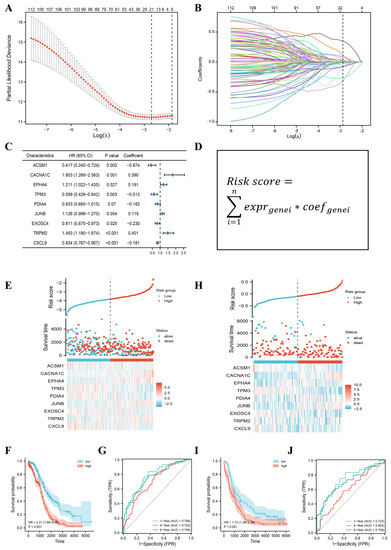 We used the LASSO regression method to first test the genes used to generate the prognostic signature. The most stable model was found at a minimum value of the penalty parameter (λ = 0.067) (Figure 2A,B). We then selected 21 candidate gene variables under this optimal condition for further analysis. ACSM1, CACNA1C, EPHA4, TPM3, PDIA4, JUNB, EXOSC4, TRPM2, and CXCL9 were identified as independent prognostic factors by multifactorial Cox regression (Table 1). Based on the baseline coefficients, we constructed a prognostic feature based on nine PRGs (Figure 2C,D).