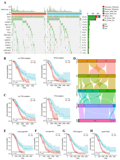 In fact, TP53 mutations and TTN mutations have become a common process in the progression of many cancers [38,39]. TP53 is often characterized as a DNA-binding transcription factor involved in the response to multiple stress signals in tumors and plays an oncogenic role in tumors [40]. However, mutant TP53 orchestrates emergency response mechanisms in the tumor microenvironment, contributing to continued tumor survival and progression under adverse conditions. TP53 appears to have a very high mutation frequency in OC, especially in high-grade plasmacytotic OC, which represents a poor prognosis [41,42]. TTN is one of the most commonly mutated genes in the pan-cancer cohort and is associated with poorer prognosis in a variety of human solid tumors [43,44,45]. Mutations in TTN, which encodes a large number of rhabdomeric proteins, may interfere with intrinsically disordered protein regions of tumors or contribute to promote chromosomal instability [46]. Despite the lack of corresponding studies in OC, its association with high mortality has been well analyzed [47]. In addition, OC is less friendly to older women than younger women, as evidenced by a higher mortality rate and a greater likelihood of being initially diagnosed with advanced disease [48]. FIGO staging and grade are well known indicators of OC malignancy and are associated with poor prognosis. Our signature showed good discriminatory power in the presence or absence of TP53 or TTN mutations and superior prognostic diagnostic ability especially in patients with TTN mutations. The signature-based high-risk population was identified with worse prognosis in the cohort of young women, the cohort of older women, the FIGO 3 cohort, and the GRADE 3&4 cohort. These results demonstrate the validity and independence of our signature.