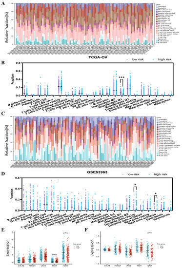 Immune cell landscape and immune checkpoints in different risk subgroups (*, p < 0.05; **, p < 0.01; ***, p < 0.001). (A) Immune cell landscape in the TCGA cohort. (B) Proportion of infiltrating immune cell subsets according to risk subgroup in the TCGA cohort. (C) Immune cell landscape in the GEO cohort. (D) Proportion of infiltrating immune cell subsets according to risk subgroup in the GEO cohort. (E) Immune checkpoint expression in the TCGA cohort. (F) Immune checkpoint expression in the GEO cohort.