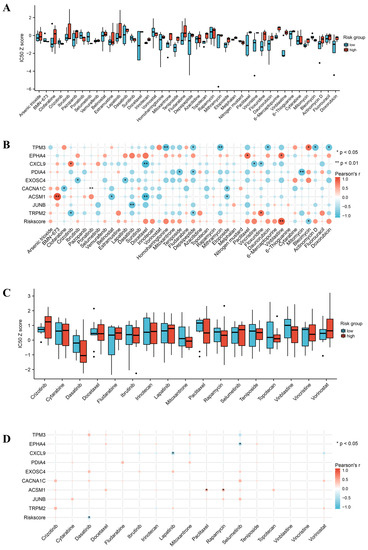 Association of risk subgroups or scores with drug sensitivity (*, p < 0.05; **, p < 0.01). (A) Drug sensitivities of different risk subgroups were obtained from CellMiner. (B) Correlation of drug IC50 with expression levels of 9 PRGs and risk scores in CellMiner. (C) Drug sensitivities of different risk subgroups obtained from GDSCv2. (D) Correlation of drug IC50 with expression levels of 9 PRGs and risk scores in GDSCv2. IC50, drug half-inhibitory concentration.