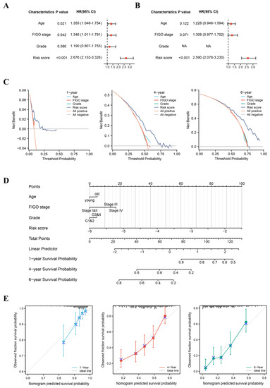 Construction of the nomogram. (A) Univariate Cox regression analysis of clinical features and risk scores in the TCGA cohort. (B) Multivariate Cox regression analysis of clinical features and risk scores in the TCGA cohort. (C) Decision curve analysis plots. (D) Nomogram for predicting 1-year, 4-year, and 6-year OS in OC. (E) Calibration curves for nomogram. OS, overall survival.