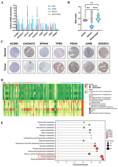 The mRNA and protein expression levels of nine PRGs(**, p < 0.01; ***, p < 0.001). (A) The mRNA expression levels of 9 PRGs in IOSE, A2780, SKOV3, and SKOV3/DDP. (B) Risk scores of A2780, SKOV3, and SKOV3/DDP. (C) Immunohistochemical data from the HPA database. (D) Heatmap of the comprehensive nontarget metabolomic analysis of SKOV3 and SKOV3/DDP. (E) KEGG enrichment of differential metabolites between SKOV3 and SKOV3/DDP. The red frame marks the purine metabolism pathway.