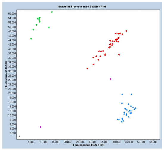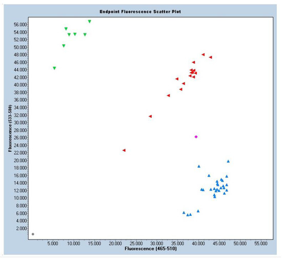 Sample distribution scatter plot. Blue fluorescence for allele G: GG. Green fluorescence for allele A: AA. Red fluorescence for heterozygosity AG. Magenta fluorescence means uncertainty, maybe because of DNA quality. Grey color is used as a negative control as it has no DNA.