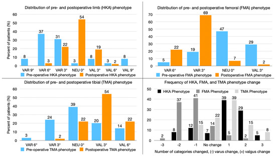 The pre- and postoperative functional phenotype distribution is illustrated in Figure 1. Remarkably, 42% of the HKA phenotype and 41% of the FMA phenotype, but only 25% of the TMA phenotype were changed to more than one category by MA TKA (Figure 1).