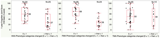 For the one-year FJS, patients with a HKA phenotype change of more than one category had a significantly lower median score of 27 points relative to the 59-point score of those with no or only one category change (p = 0.0002) (Figure 2). In addition, patients with a FMA phenotype change of more than one category had a significantly lower median score of 28 points relative to the 69-point score of those with no or only one category change (p < 0.0001). A change in TMA phenotype had no effect on the FJS.