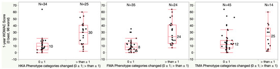 For the one-year WOMAC, patients with a HKA phenotype change of more than one category had a significantly higher median score of 30 points relative to the 10-point score of those with no or only one category change (p = 0.0002) (Figure 4). In addition, patients with a FMA phenotype change of more than one category had a significantly higher median score of 24 points relative to the 8-point score of those with no or only one category change (p < 0.0001). A change in TMA phenotype had no effect on the WOMAC score.