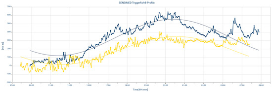Example of the 24 h intraocular pressure-related pattern before and after ripasudil eye drop administration. Contact lens sensor (CLS) pattern before (blue tracing) and after (yellow tracing) administration. Smooth curve: cosine fit curve. Polygonal line: CLS raw data.